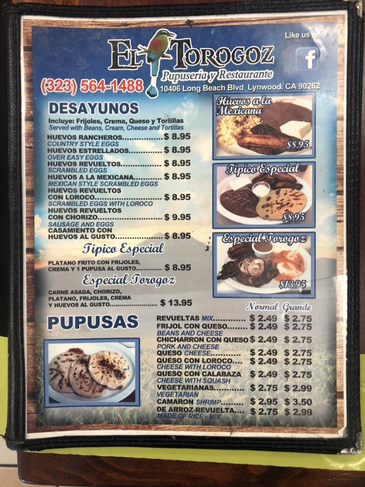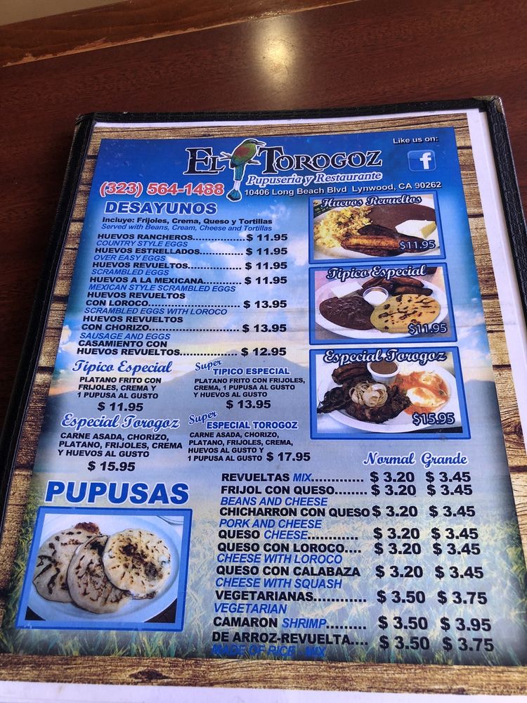 El Torogoz is a Salvadoran restaurant located in Lynwood, CA, known for its delicious pupusas and traditional Salvadoran dishes. The menu includes a variety of antojitos Salvadorenos like meat dumplings, fried plantains, and chicken tamales. For breakfast, they offer a selection of egg dishes and tipico especiales. Customers rave about the pupusas, praising the flavorful fillings and generous portions. Reviews mention the friendly service, laid-back atmosphere, and reasonable prices. Some guests note that the parking can be limited and service may be slow during busy times, but overall, El Torogoz is a must-visit for authentic Salvadoran cuisine. Whether you're a pupusa enthusiast or looking to try traditional Salvadoran flavors, El Torogoz is a great choice for a satisfying meal.